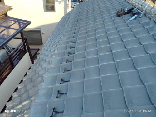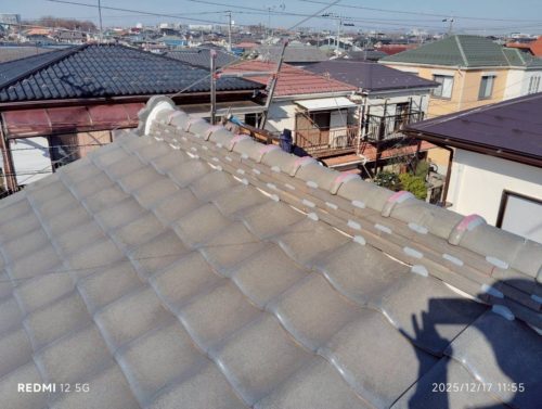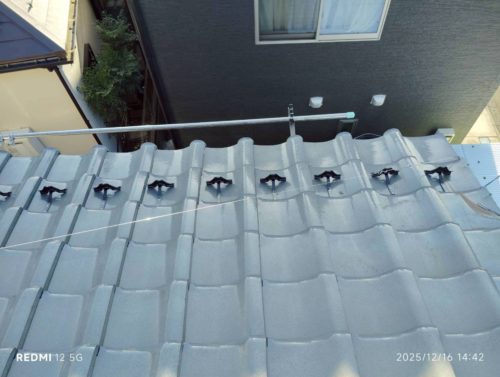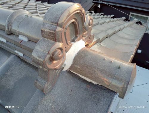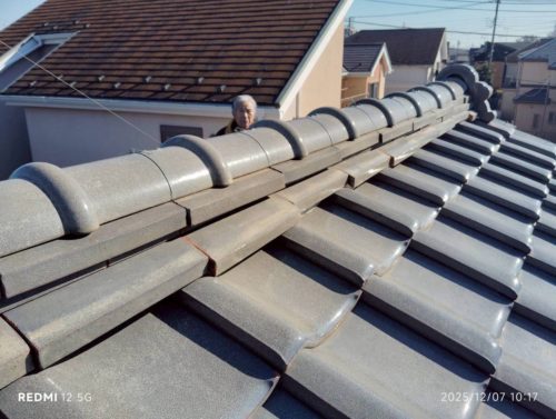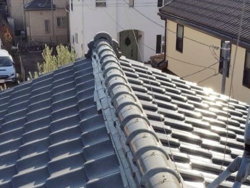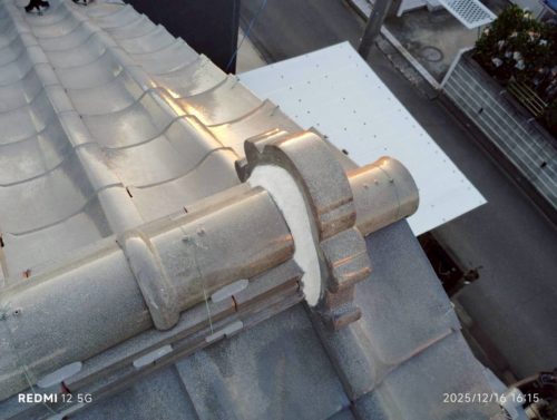 崩れていた棟(むね)は、本来ならば積み直したほうが良いのですが、お客様が必要最低限の予算で納めてほしいと希望されたので、ズレを調整して強力なボンドで補強しました。